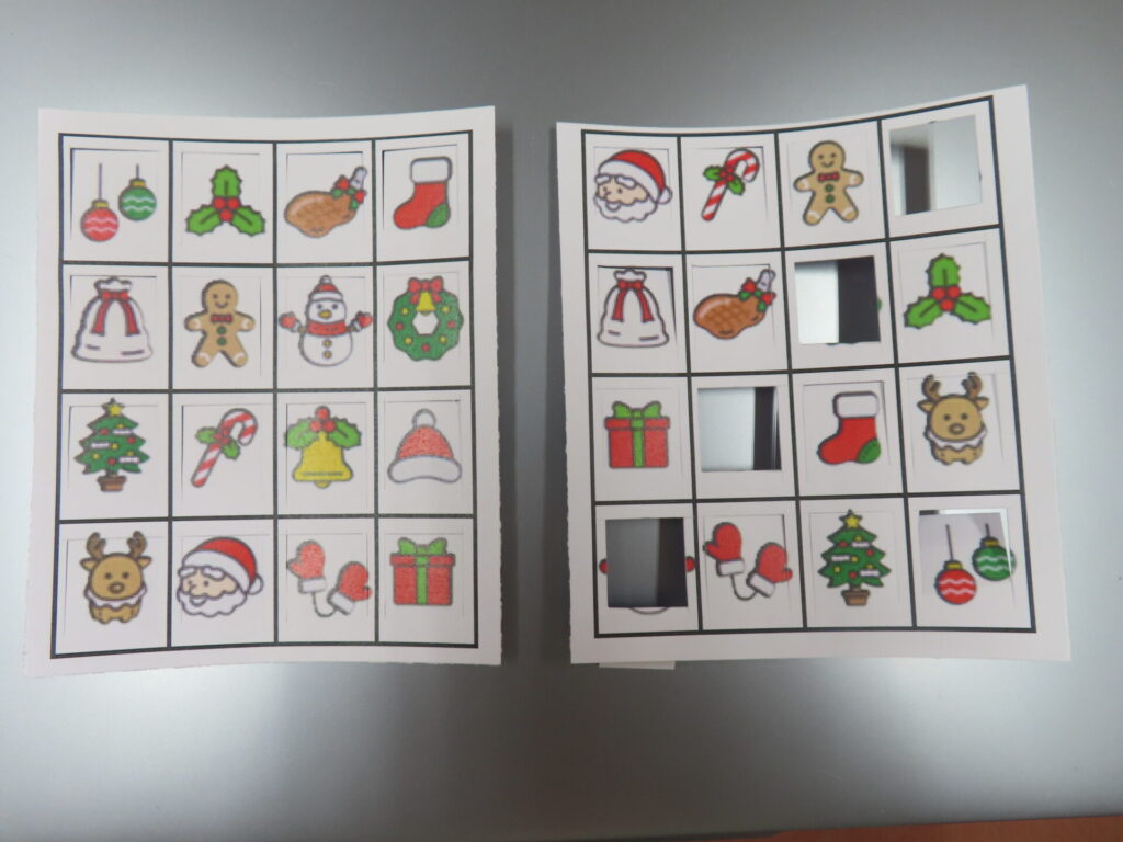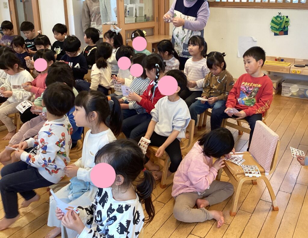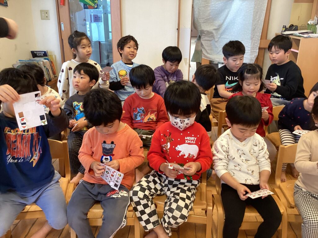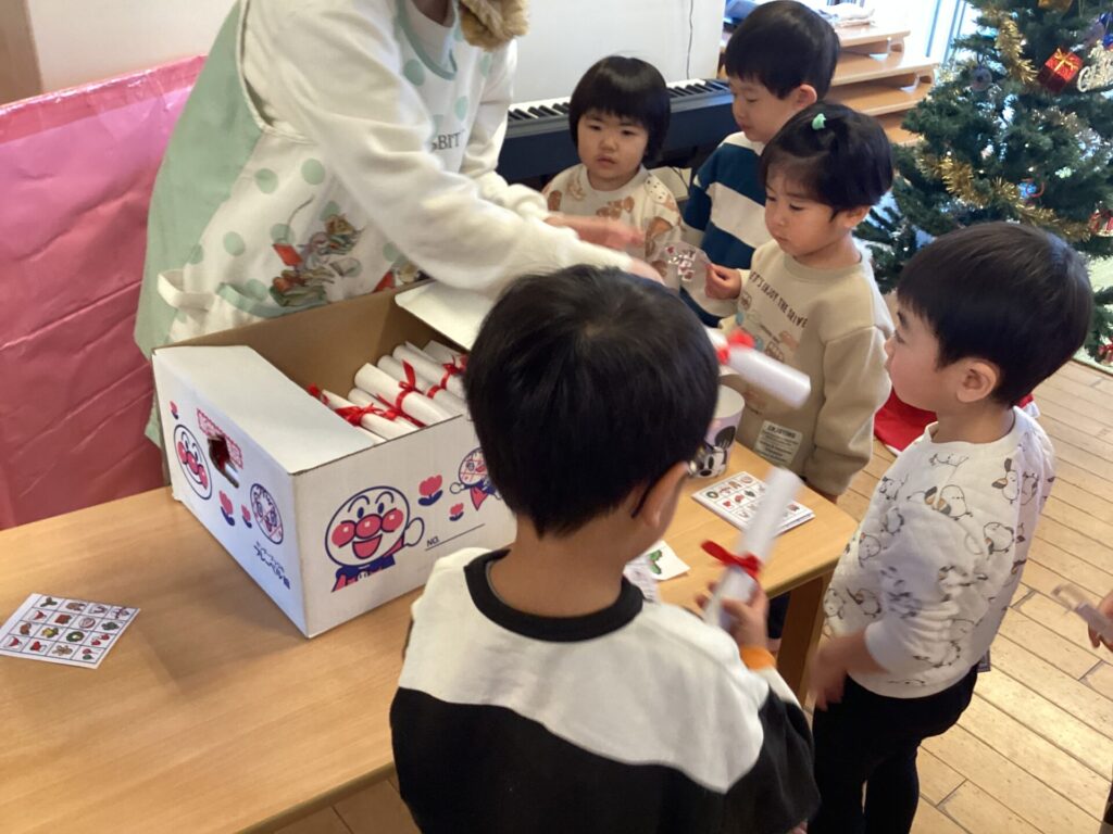 その後は2~5歳児クラスでビンゴ大会!クリスマス柄の書かれたカードでビンゴを目指します!