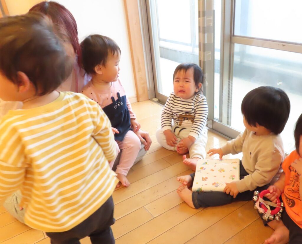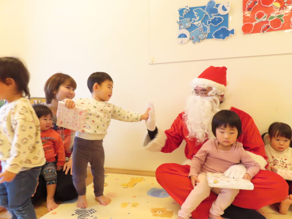 大きなサンタさんにびっくりしたようで、泣いている子や、「サンタさんだー!」とタッチを求めたりプレゼントを自らもらいに行く子など様々な姿が見られました♪